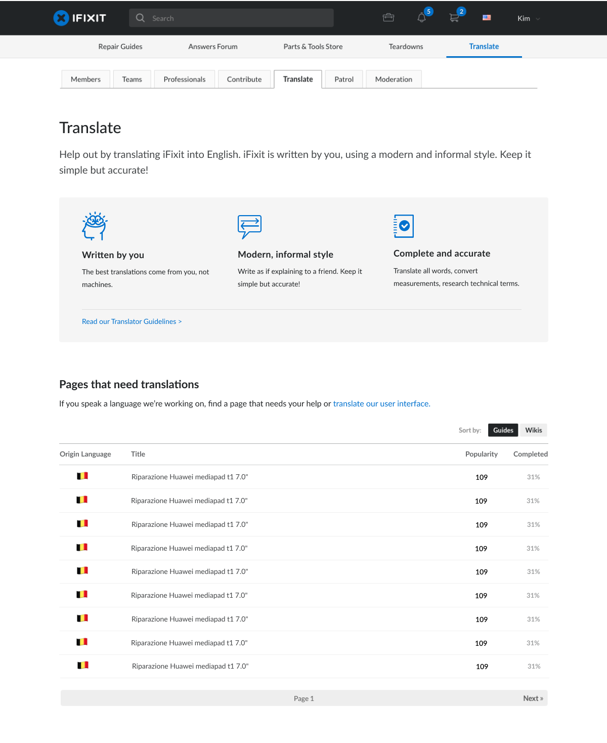 Since the requirement to include a link to translate the user interface on an external website was such a small visual element compared to its hierarchical equal (the giant table of guides), finding an intuitive layout took a few attempts.